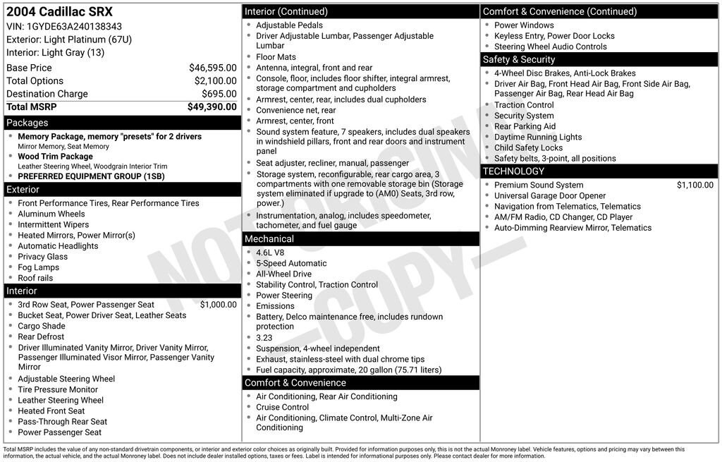 A short drive from Athens, Cambridge, Chillicothe, Circleville, Columbus, Lancaster, Logan, Marietta, Nelsonville, Newark, Pickerington, Pomeroy, and Zanesville in Ohio, as well as Charleston, Clarksburg, Huntington, Morgantown, Parkersburg, Vienna, and Wheeling in West Virginia. 2065 East State St. Athens, OH 45701. Near Ohio University! Down the road from Hocking Hills! Vehicle: 2004 Cadillac SRX V8 Price: (live market adjusted) CarFax: True, available today Stock#: F8F0149DT | VIN Ending: 1GYDE63A240138343 Delivery: Nationwide delivery available.