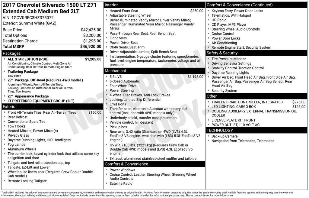 A short drive from Athens, Cambridge, Chillicothe, Circleville, Columbus, Lancaster, Logan, Marietta, Nelsonville, Newark, Pickerington, Pomeroy, and Zanesville in Ohio, as well as Charleston, Clarksburg, Huntington, Morgantown, Parkersburg, Vienna, and Wheeling in West Virginia. 12916 Ohio State Route 664 Logan, OH 43138. Located in the Hocking Hills! Close to Ohio University! Vehicle: 2017 Chevrolet Silverado 1500 LT Price: 20000 (live market adjusted) CarFax: True, available today Stock#: C375072P | VIN Ending: 1GCVKREC3HZ375072 Delivery: Nationwide delivery available.