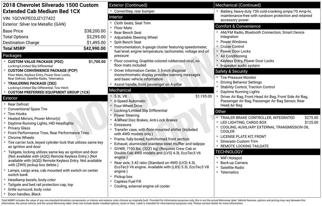 CARFAX One-Owner! Integrated Trailer Brake Controller, 4-Wheel Drive, EcoTec3 5.3L V8, 150 Amp Alternator, 20" x 9" Chrome Clad Aluminum Wheels, 3-Passenger Full-Width Folding Rear Bench Seat, 3.42 Rear Axle Ratio with Locking Rear Differential, 4-Wheel Disc Brakes, 40/20/40 Front Split Bench Seat, Air Conditioning, Alloy wheels, Auxiliary External Transmission Oil Cooler, Black Power Adjustable Heated Outside Mirrors, Bluetooth® For Phone, Body Color Rear Bumper w/Cornersteps, Body-Color Grille Surround, Body-Color Headlamp Bezels, Chevrolet w/4G LTE, Color-Keyed Carpeting w/Rubberized Vinyl Floor Mats, Custom Convenience Package, Custom Value Package, Deep-Tinted Glass, Delay-off headlights, Driver Information Center, Electric Rear-Window Defogger, Exterior Parking Camera Rear, Front Body-Color Bumper, Front Center Armrest w/Storage, Front Frame-Mounted Black Recovery Hooks, Front wheel independent suspension, Fully Automatic (HID) High-Intensity Discharge Headlights, Fully automatic headlights, Graphite-Colored Rubberized-Vinyl Floor Covering, Heated door mirrors, Heavy Duty Suspension, Heavy-Duty Rear Locking Differential, Integrated Trailer Brake Controller, Manual Tilt Wheel Steering Column, OnStar & Chevrolet Connected Services Capable, Power Windows w/Driver Express Up, Preferred Equipment Group 1CX, Premium audio system: Chevrolet MyLink, Radio: AM/FM w/7" Diagonal Color Touch Screen, Rear step bumper, Remote Keyless Entry, Remote Locking Tailgate, Silverado Custom Trim, SiriusXM Satellite Radio, Tilt Steering Wheel, Trailering Package, Trip Computer.