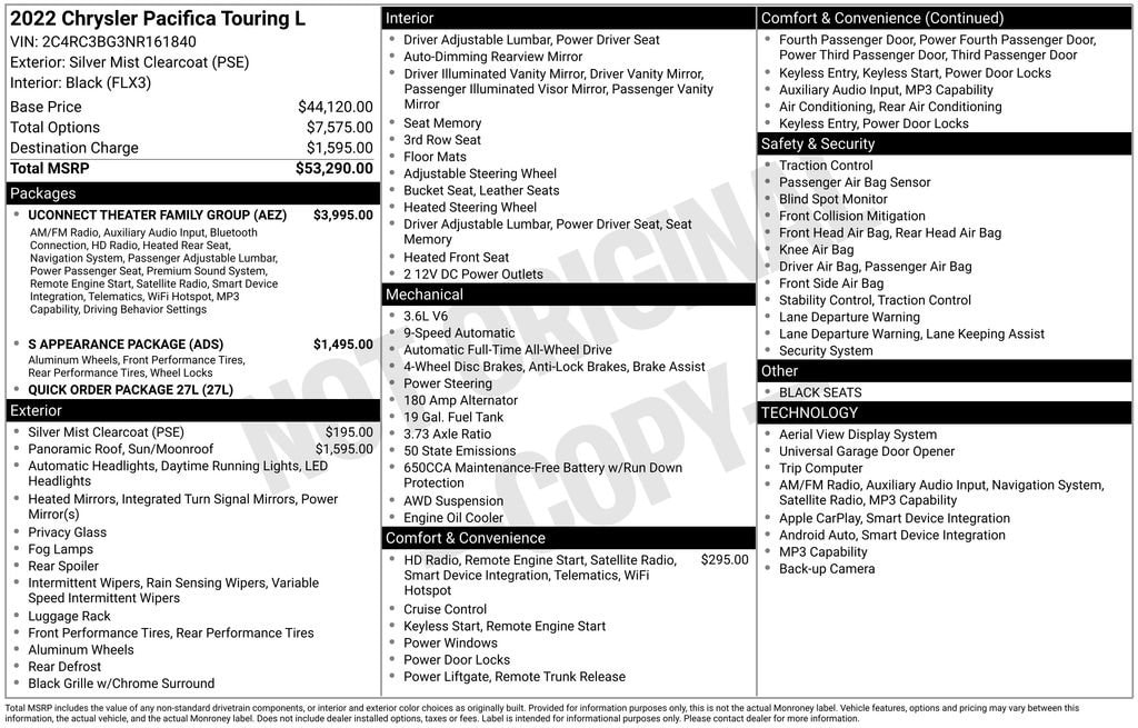 Pacifica Touring L, AWD, Clean CARFAX!, CARFAX One-Owner!, 10.1" Touchscreen Display, 115V Auxiliary Power Outlet, 13 Alpine Speakers, 220 Amp Alternator, 3-Channel Video Remote Control, 3rd row seats: split-bench, 3rd Row USB Charge Port, 506 Watt Amplifier, Amazon Fire TV Built-In, Anodized Ice Cave Accents, Anodized Ink Badging, Apple CarPlay, Black Day Light Opening Moldings, Black Seats, Blu-Ray/DVD Player/USB Port, Disassociated Touchscreen Display, Famcam Interior Camera, For More Info, Call 800-643-2112, Four wheel independent suspension, Front Passenger Auto Advance N Return, Front/Rear 1-Touch Up/Down Power Windows, Google Android Auto, GPS Antenna Input, GPS Navigation, Hands Free Sliding Doors, HD Radio, Heated Second Row Seats, High Definition Multimedia Interface, Integrated Active Noise Cancellation, Integrated Center Stack Radio, Integrated Voice Command w/Bluetooth, KeySense, Perforated Leather Bucket Seats w/S Logo, Piano Black Interior Accents, Pirelli Brand Tires, Power Adjust 8-Way Front Passenger Seat, Power driver seat, Power Liftgate, Power Passenger Lumbar Adjust, Premium Fascia Upper/Lower Grille w/Black Surround, Premium Rear Fascia Black, Radio: Uconnect 5 Nav w/10.1" Display, S Appearance Package, S Badge, Seatback Video Screens, SiriusXM Guardian - Included Trial (B), SiriusXM Radio Service, SiriusXM Satellite Radio, Stow N Vac Integrated Vacuum, Uconnect Theater Family Group, USB Host Flip, Video USB Port, Wheels: 18" x 7.5" Polished Aluminum Design 2, Wheels: 20" x 7.5" S-Model Aluminum Design 1.