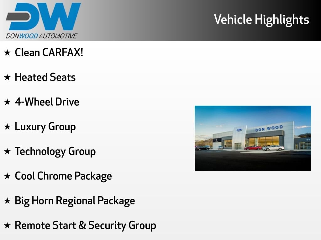 Clean CARFAX!, HEMI 5.7L V8 Multi Displacement VVT, Heated Seats, 4-Wheel Drive, 115V Auxiliary Power Outlet, 20" x 8" Aluminum Wheels, 20" x 9" Chrome Clad Aluminum Wheels, 6.5" Touch Screen Display, 9 Amplified Speakers w/Subwoofer, Anti-Spin Differential Rear Axle, Auto-Dimming Exterior Mirrors, Auto-Dimming Rear-View Mirror, Big Horn Regional Package, Bighorn Badge, Black Exterior Mirrors, Brake assist, Bright/Bright Billets Grille, Chrome Bodyside Molding, Cloth 40/20/40 Bench Seat, Cool Chrome Package, Delay-off headlights, Dual Rear Exhaust, Electronic Stability Control, Fog Lamps, Fully automatic headlights, Halogen Quad Headlamps, Heated door mirrors, Heated Front Seats, Luxury Group, Mopar Chrome Tubular Side Steps, Overhead console, Panic Alarm, ParkSense Rear Park Assist System, Power door mirrors, Power Heated Fold-Away Mirrors, Remote Start & Security Group, Remote Start System, Security Alarm, Speed control, Technology Group, Uconnect Phone w/Voice Command.