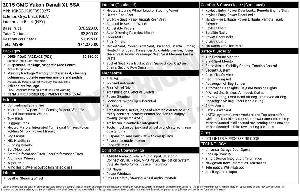 A short drive from Athens, Cambridge, Chillicothe, Circleville, Columbus, Lancaster, Logan, Marietta, Nelsonville, Newark, Pickerington, Pomeroy, and Zanesville in Ohio, as well as Charleston, Clarksburg, Huntington, Morgantown, Parkersburg, Vienna, and Wheeling in West Virginia. 2065 East State St. Athens, OH 45701. Near Ohio University! Down the road from Hocking Hills! Vehicle: 2015 GMC Yukon XL Denali Price: (live market adjusted) CarFax: True, available today Stock#: FL07985PAT | VIN Ending: 1GKS2JKJ5FR523277 Delivery: Nationwide delivery available.
