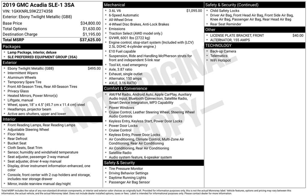 A short drive from Athens, Cambridge, Chillicothe, Circleville, Columbus, Lancaster, Logan, Marietta, Nelsonville, Newark, Pickerington, Sandusky, and Zanesville in Ohio, as well as Charleston, Clarksburg, Huntington, Morgantown, Parkersburg, Vienna, and Wheeling in West Virginia. 27350 Darl Rd. Rockbridge, OH 43149. Located in the Hocking Hills! Close to Ohio University! Vehicle: 2019 GMC Acadia SLE-1 Price: 16999 (live market adjusted) CarFax: True, available today Stock#: J274358P | VIN Ending: 1GKKNRLS9KZ274358 Delivery: Nationwide delivery available.