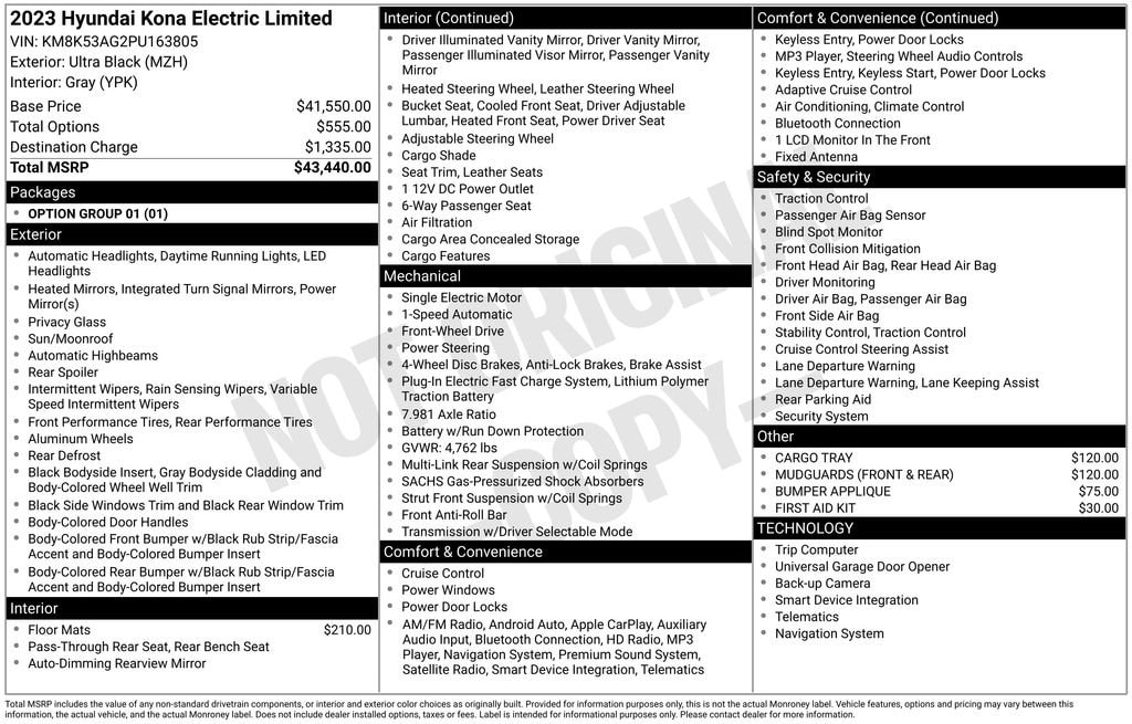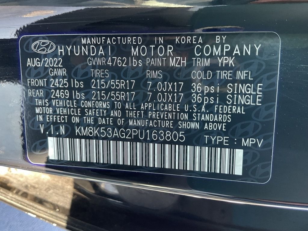 CARFAX One-Owner! Forward Collision Avoidance Assist, Blind Spot Collision Avoidance Assist, Rear Cross Traffic Collision Avoidance Assist, Lane Following Assist, Driver Attention Warning, Rear Occupant Alert, Safe Exit Warning, Front And Side Curtain Airbags, Immobilizer, Power Sunroof, Leather Seating Surfaces, Power Driverâs Seat With Lumbar Support, Heated And Ventilated Front Seats, Heated Steering Wheel, Automatic Temperature Control, Digital Key, Proximity Key With Push Button Start, Highway Driving Assist, Smart Cruise Control, 10.25 Inch Digital Instrument Cluster, 10.25 Inch Touchscreen Navigation, Harman Kardon Premium Audio, Android Auto And Apple CarPlay, Wireless Phone Charger, SiriusXM Radio, Rearview Monitor, Parking Distance Warning Reverse, Front And Rear USB Charging Ports, Auto Dimming Rearview Mirror With HomeLink, Bluelink Connected Services, 17 Inch Alloy Wheels, LED Headlights, Taillights And Daytime Running Lights, High Beam Assist, Heated Side Mirrors With Turn Signal Indicators, Passenger Sliding Sunroof, Tire Mobility Kit, Single Front Mounted Electric Motor, Lithium Ion Battery System, DC Fast Charging Capability, Regenerative Brake Level Control Paddles. This collection of safety technologies supports confident driving through active collision avoidance, blind spot support and lane guidance, while attentive driver monitoring and safe exit alerts strengthen situational awareness in daily use. Premium seating materials, climate controlled front seats and a heated steering wheel enhance comfort in varied weather, and the power sunroof opens the cabin to light and airflow. Dual 10.25 inch displays create a modern interface that pairs navigation, smartphone integration and high fidelity audio for streamlined connectivity. Convenience features like proximity access, smart cruise control, wireless charging and multiple power ports keep routines efficient, while exterior lighting and heated mirrors improve visibility. The electric motor and lithium ion battery system deliver smooth, quiet operation with regenerative braking assisting range and energy management, supported by fast charging capability for minimal downtime..