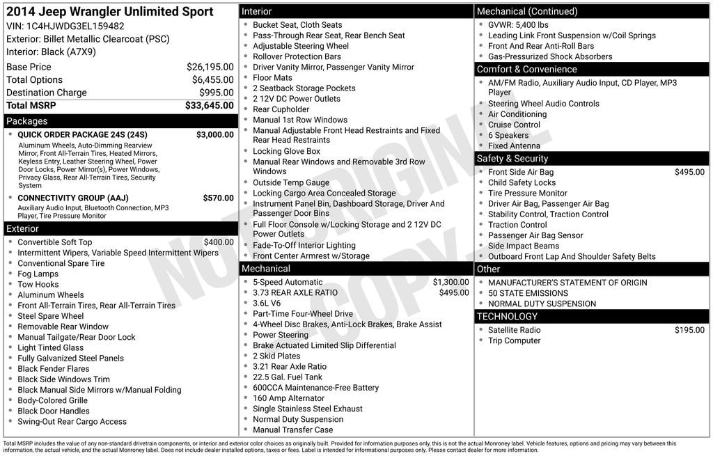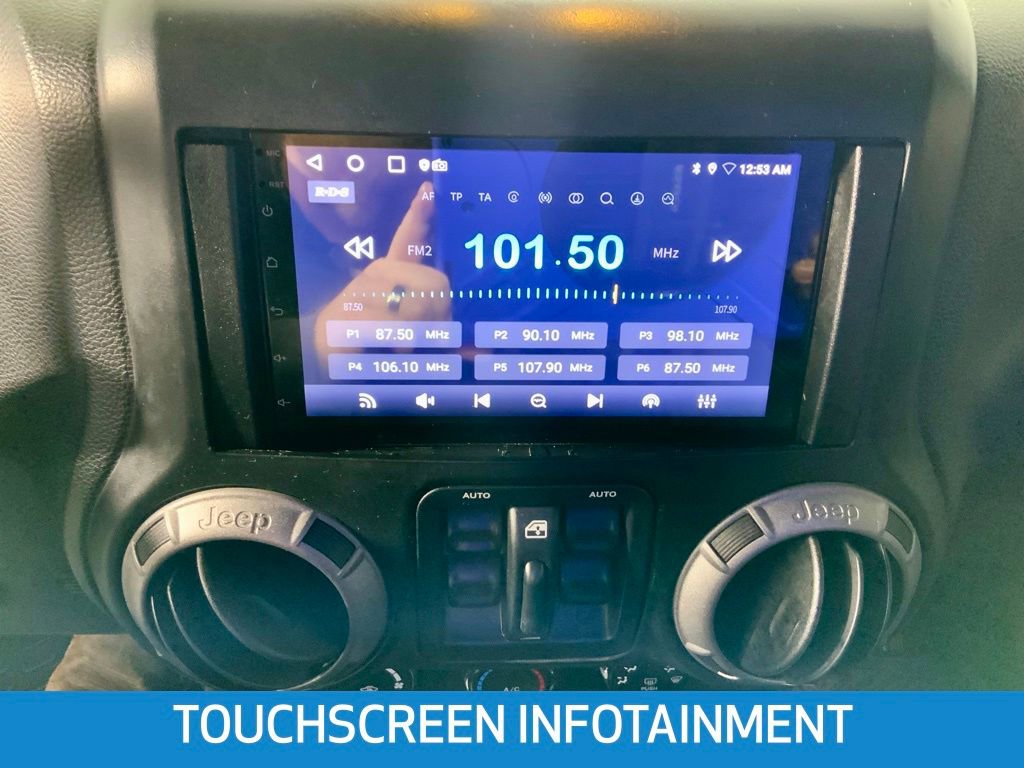 4-Wheel Disc Brakes, 6 Speakers, ABS Brakes, Air Conditioning, Auto-Dimming Mirror w/Reading Lamp, Brake assist, Cloth Bucket Seats, Connectivity Group, Deep Tint Sunscreen Windows, Driver vanity mirror, Electronic Stability Control, Front 1-Touch Down Power Windows, Front Bucket Seats, Front Center Armrest w/Storage, Integrated roll-over protection, Leather Wrapped Steering Wheel, Low Tire Pressure Warning, Outside temperature display, Passenger door bin, Power Heated Mirrors, Quick Order Package 24S, Radio: Uconnect 130 AM/FM/CD/MP3, Remote Keyless Entry, Remote USB Port, Split folding rear seat, Steering wheel mounted audio controls, Sunrider Soft Top, Supplemental Front Seat Side Airbags, Tilt Steering Wheel, Tire Pressure Monitoring Display, Traction Control, Trip Computer, Uconnect Voice Command w/Bluetooth, Vehicle Information Center.