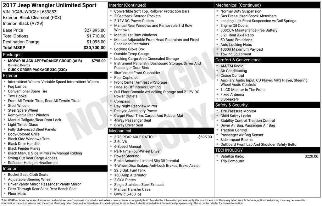 4-Wheel Disc Brakes, 8 Speakers, Air Conditioning, AM/FM Stereo, Black/Chrome Screws Fuel Filler Door, Brake assist, CD player, Cloth Seats w/Adjustable Head Restraints, Electronic Stability Control, Front Bucket Seats, MOPAR Black Appearance Group, Mopar Black Tubular Side Steps, Normal Duty Suspension, Outside temperature display, Quick Order Package 23C, Speed control, Split folding rear seat, Steering wheel mounted audio controls, Traction Control, Uconnect Radio 130 w/Bluetooth, Auxiliary Jack, Sirius XM w/4 Speakers.
