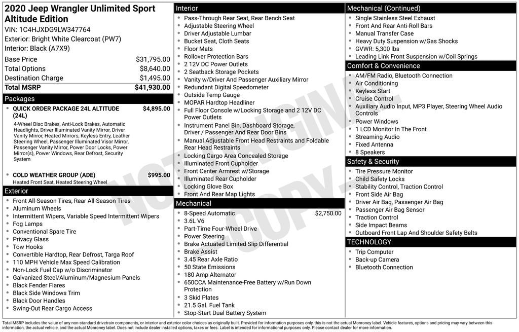 Clean CARFAX! Uconnect 3 With Five-Inch Display, Integrated Voice Command With Bluetooth, Media Hub With USB And Auxiliary Input, Eight-Speaker Audio System, Steering Wheel Mounted Audio Controls, Air Conditioning, Tilt And Telescoping Steering Column, Rear Sixty-Forty Folding Seat, Two-Way Manual Lumbar Adjustable Driver Seat, Rear Compartment Storage Tray, Leather-Wrapped Steering Wheel, Heated Steering Wheel, Heated Front Seats, Remote Start System, Power Front Windows With One-Touch Down, Speed-Sensitive Power Door Locks, Illuminated Vanity Mirrors, Freedom-Panel Storage Bag, Rear Window Defroster, Rear Window Wiper And Washer, Motion Activated Liftgate, Black Three-Piece Hard Top With Hardtop Headliner, Deep Tint Sunscreen Windows, Body-Color Grille With Gloss Black Accents, Black Interior Accents, Halogen Headlamps, Automatic Headlamps, Front Fog Lamps, Incandescent Tail Lamps, Power Heated Mirrors, Tow Hooks Front And Rear, Heavy-Duty Suspension With Gas Shocks, Fuel Tank Skid Plate Shield, Transfer Case Skid Plate Shield, Transmission Skid Plate, ParkView Rear Back-Up Camera, Electronic Stability Control, Electronic Roll Mitigation, Trailer Sway Damping, Hill Start Assist, Tire Pressure Monitoring Display, Advanced Multistage Front Airbags, Supplemental Front Seat Side Airbags, Command-Trac Part-Time Four-Wheel Drive System, 3.6L V6 24V VVT Engine, Rear Axle Ratio 3.45. This vehicle combines rugged capability with modern convenience, offering advanced connectivity through Uconnect and Bluetooth integration, while comfort features such as heated seats, heated steering wheel, and remote start enhance every drive. Safety technologies including electronic stability control, trailer sway damping, and multiple airbags provide confidence on and off the road. Exterior highlights like a three-piece hard top, body-color grille, and tow hooks deliver a bold and functional design, and the 3.6L V6 engine paired with a part-time four-wheel drive system ensures strong performance for challenging terrain..