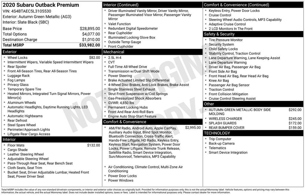 A short drive from Athens, Cambridge, Chillicothe, Circleville, Columbus, Lancaster, Logan, Marietta, Nelsonville, Newark, Pickerington, Sandusky, and Zanesville in Ohio, as well as Charleston, Clarksburg, Huntington, Morgantown, Parkersburg, Vienna, and Wheeling in West Virginia. 27350 Darl Rd. Rockbridge, OH 43149. Located in the Hocking Hills! Close to Ohio University! Vehicle: 2020 Subaru Outback Premium Price: 15999 (live market adjusted) CarFax: True, available today Stock#: J105530P | VIN Ending: 4S4BTAEC5L3105530 Delivery: Nationwide delivery available.