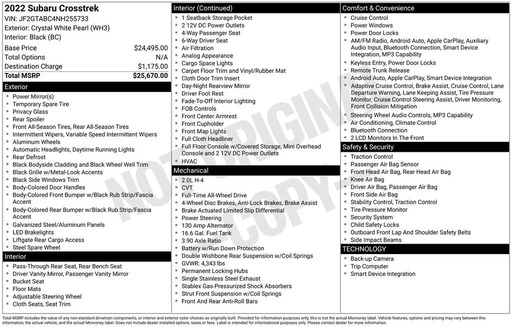 A short drive from Athens, Cambridge, Chillicothe, Circleville, Columbus, Lancaster, Logan, Marietta, Nelsonville, Newark, Pickerington, Pomeroy, and Zanesville in Ohio, as well as Charleston, Clarksburg, Huntington, Morgantown, Parkersburg, Vienna, and Wheeling in West Virginia. 810 East State St. Athens, OH 45701. Near Ohio University! Down the road from Hocking Hills! Visit us at 810 East State Street Athens, OH 45701. Vehicle: 2022 Subaru Crosstrek Price: (live market adjusted) CarFax: True, available today Stock#: H255733P | VIN Ending: JF2GTABC4NH255733 Delivery: Nationwide delivery available.