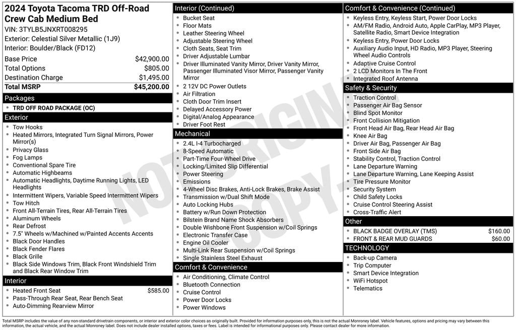 **Prices do not include additional fees and costs of closing, including government fees and taxes, any finance charges, any dealer documentation fees, any emissions testing fees or other fees. All prices, specifications and availability subject to change without notice. Contact dealer for most current information. All prices shown exclude taxes, title, license and other fees, Prices do not include dealer charges (which may vary by manufacturer or region), or other costs for selling, preparing, displaying or financing the vehicle. Dealer will not honor pricing errors displayed here. Options, pricing and availability subject to change.Plus $250 Documentary Fee.